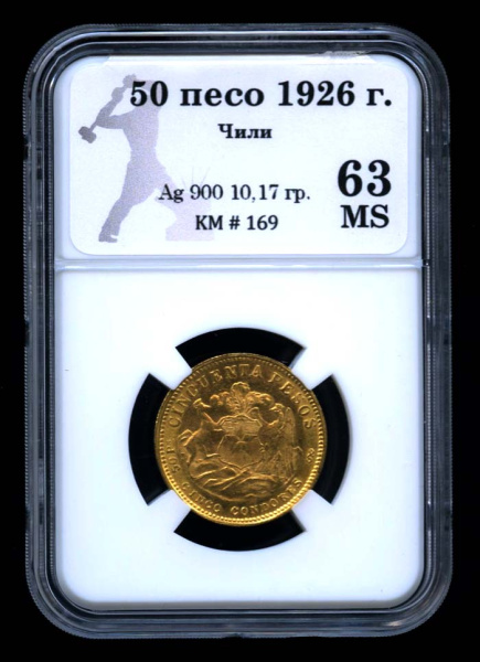 50 песо 1926 (Чили) (Коллекционная монета) 1926. В оригинальном сертифицированном слабе® MS 63 (Чили)