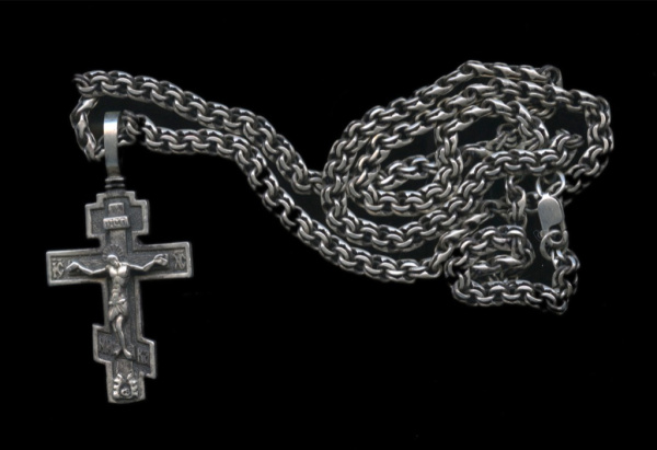 Нательный крестик на цепочке длиной 50 см. Серебро 925 пробы. Размер 2×4 см. 16,7 г (Россия)
