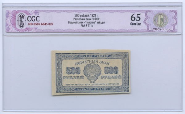 500 рублей 1921. В слабе. В слабе CGC 65 Gem Unc Водяной знак — «толстые звезды» (РСФСР)