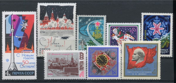 Лот негашёных марок «С Новым годом!» 8 шт, все разные, **. стоимость по каталогу Загорского ред.2021 г. = 420 руб. для ** 1964−1989 1964-1989 (СССР)