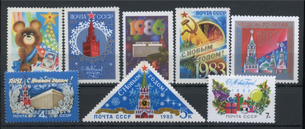 Лот негашёных марок «С Новым годом!» 8 шт, все разные, **. стоимость по каталогу Загорского ред.2021 г. = 185 руб. для ** 1978−1991 1978-1991 (СССР)