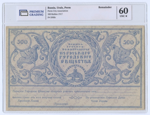 500 рублей Пермское Городское Общество 1917. В слабе. В слабе PREMIUM GRADING 60 (Россия: Гражданская война)