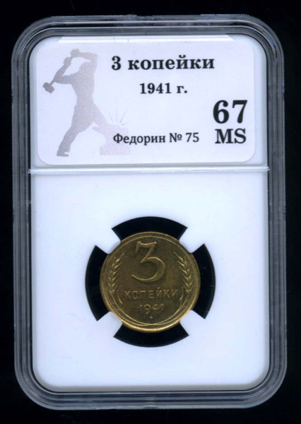 3 копейки — Венок 11 лент. л/c: Звезда выпуклая (фигурная) 1941. В оригинальном сертифицированном слабе® MS 67 - (СССР)