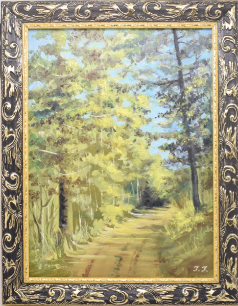 Картина «Дорога через лес». Автор: Галина Гусева. Масло. Размер 47×38 см. Холст на картоне грунтованный (Россия)
