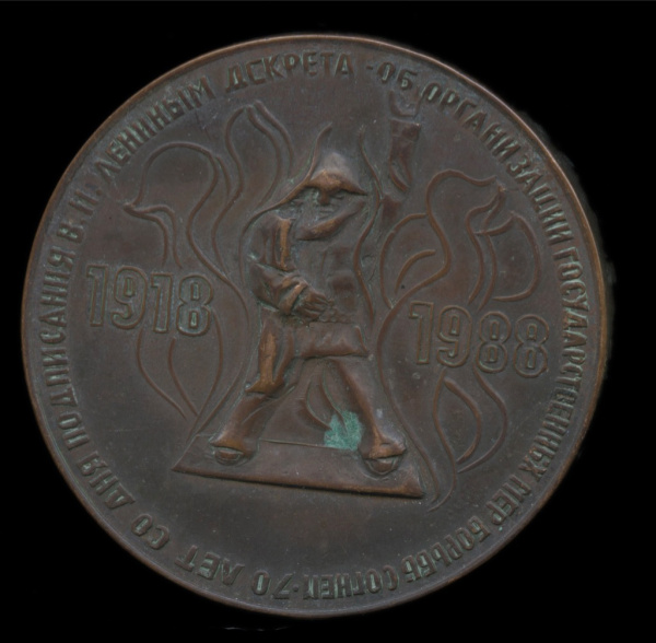 Медаль настольная «70 лет со дня подписания лениным декрета об организации государственных мер борьбы с огнем». ⌀ 6 см 1988 (СССР)