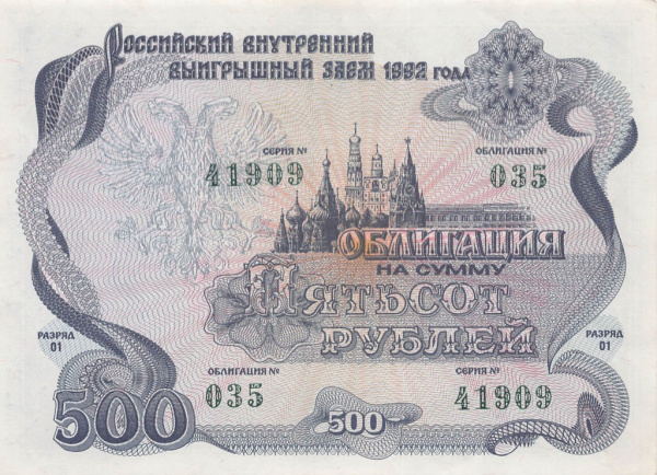 500 рублей — Облигация. Синий 1992 - (Россия)