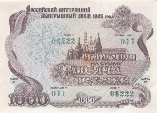 1000 рублей — Облигация. Коричневый 1992 - (Россия)