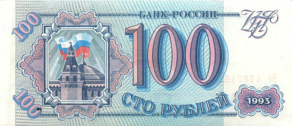 Банкнота регулярного выпуска: 100 рублей 1993 года «Серая бумага». Билеты Банка России 1993 г. Российская Федерация: Банк России (1992 — 1996).