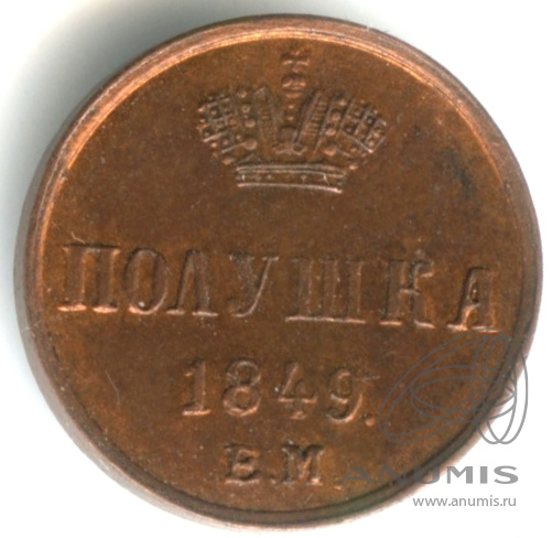полушка 1849 ЕМ. Новодел. фрагменты красного штемпельного блеска. Биткин — 620 (R2)
