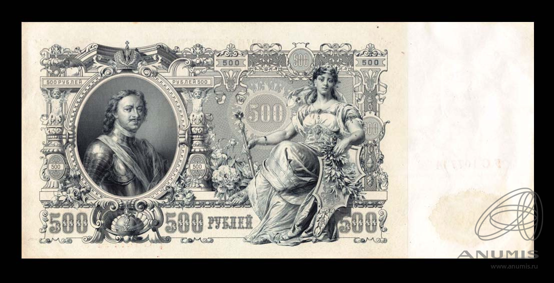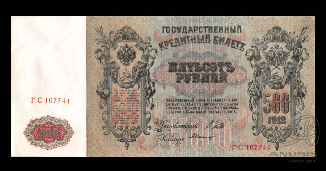 Банкнота регулярного выпуска: 500 рублей 1912 года «упр. Шипов. Былинский». Государственные Кредитные Билеты 1898 — 1912 гг. И.П. Шипов. Российская Империя: Николай II (1894 — 1917).