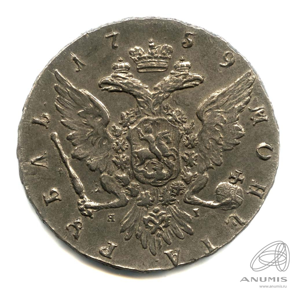 Монета регулярного выпуска: 1 рубль 1759 года «Портрет Елизаветы». 1 рубль 1757 — 1761 гг «Штемпель работы Т. Иванова». Российская Империя: Елизавета Петровна (1741 — 1761). Монетный двор: Санкт-Петербургский монетный двор, г. Санкт-Петербург. Минцмейстер: Яков Иванов (1752−1766). Гравер: Тимофей Иванов. Серебро 802, 26 г, ø 40−42 мм, Гурт: Надпись. Тираж: 600782 шт.