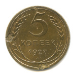 Монета регулярного выпуска: 5 копеек 1927 года «Венок 7 лент. Круговая надпись». 5 копеек 1926 — 1935 гг. Союз Советских Социалистических Республик: СССР ранний (1924 — 1958). Бронза, 5 г, ø 25 мм, Гурт: Рубчатый.