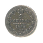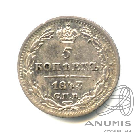 Монета регулярного выпуска: 5 копеек 1843 года «Орел 1 типа». 5 копеек 1832 — 1858 гг. Российская Империя: Николай I (1825 — 1855). Монетный двор: Санкт-Петербургский монетный двор, г. Санкт-Петербург. Минцмейстер: Алексей Иванович Чадов (1839−1843). Серебро 868, 1 г, ø 15 мм, Гурт: Пунктир. Тираж: 400000 шт.