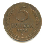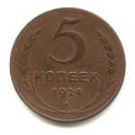 5 копеек — Гурт гладкий. На Николаевском кружке. Земной шар выпуклый 1924